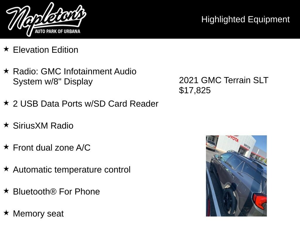 Whether you're commuting to the office, embarking on a family road trip, or tackling your next outdoor adventure, the 2021 GMC Terrain SLT Elevation Edition is the perfect companion. Experience the pinnacle of style, performance, and technology today. Come in and let us show you why this exceptional SUV should be your next vehicle.