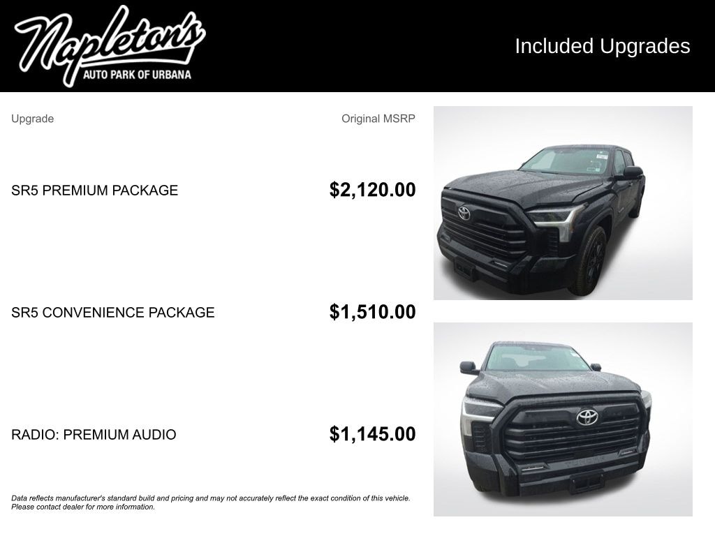 - SR5 CONVENIENCE PACKAGE including Blind Spot Monitor with Lane Change Assist, 32-gallon fuel tank, and Parking Support Alert/Brake